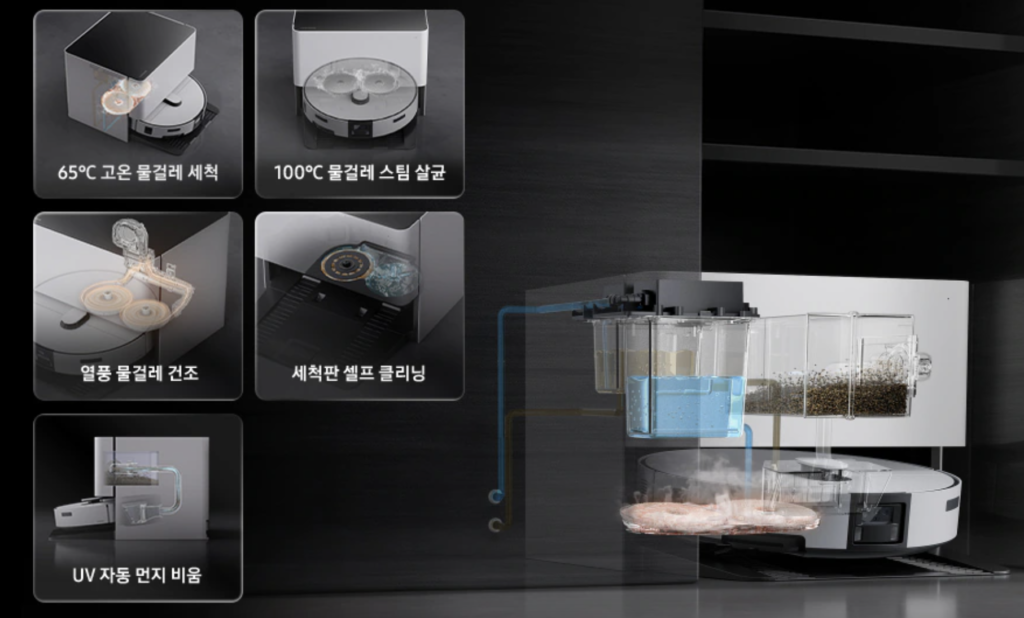 - 스테이션: 고온수 세척과 스팀 살균 기능을 갖춰 걸레의 위생 관리가 매우 편리합니다. 특히 자동 세척 관리 시스템 덕분에 스테이션 바닥이 청결하게 유지됩니다.